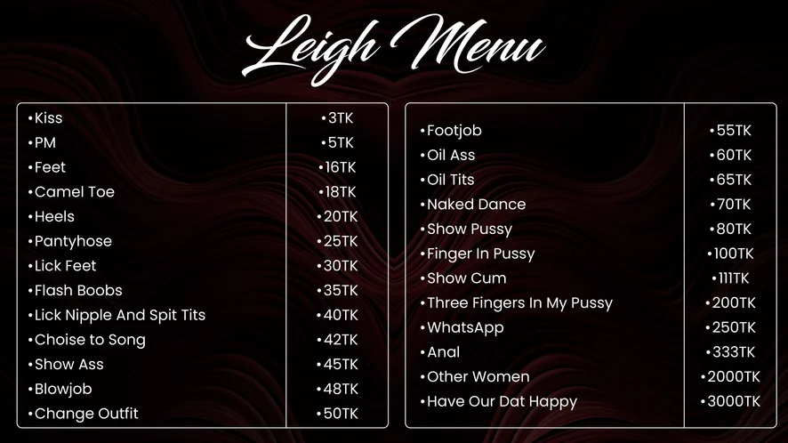 狗爬式, 阿嘿顏, 情色舞蹈, 中出, 髒話, 假陽具或按摩棒, 指交, 脫衣舞, 臉部, 淋浴, 深喉, 性愛玩具, 打屁股, 駱駝趾, 扭扭樂, 精油表演, 硬核, 69種姿勢, 打飛機, 性高潮, 無上裝, 羞辱, 口交, 吸煙